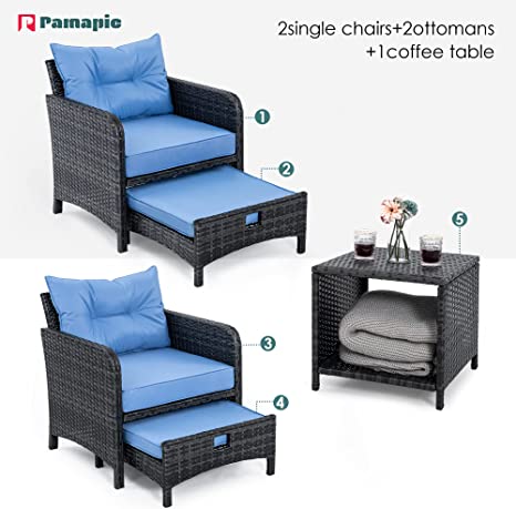 • [Luxurious & Comfortable] PAMAPIC’s 5-piece patio furniture set includes 2 single chairs, 2 ottomans and 1 coffee table. Chairs are ergonomically designed for more comfort with soft, sponge-padded cushions. Large ottomans provide you with a comfortable place to rest.